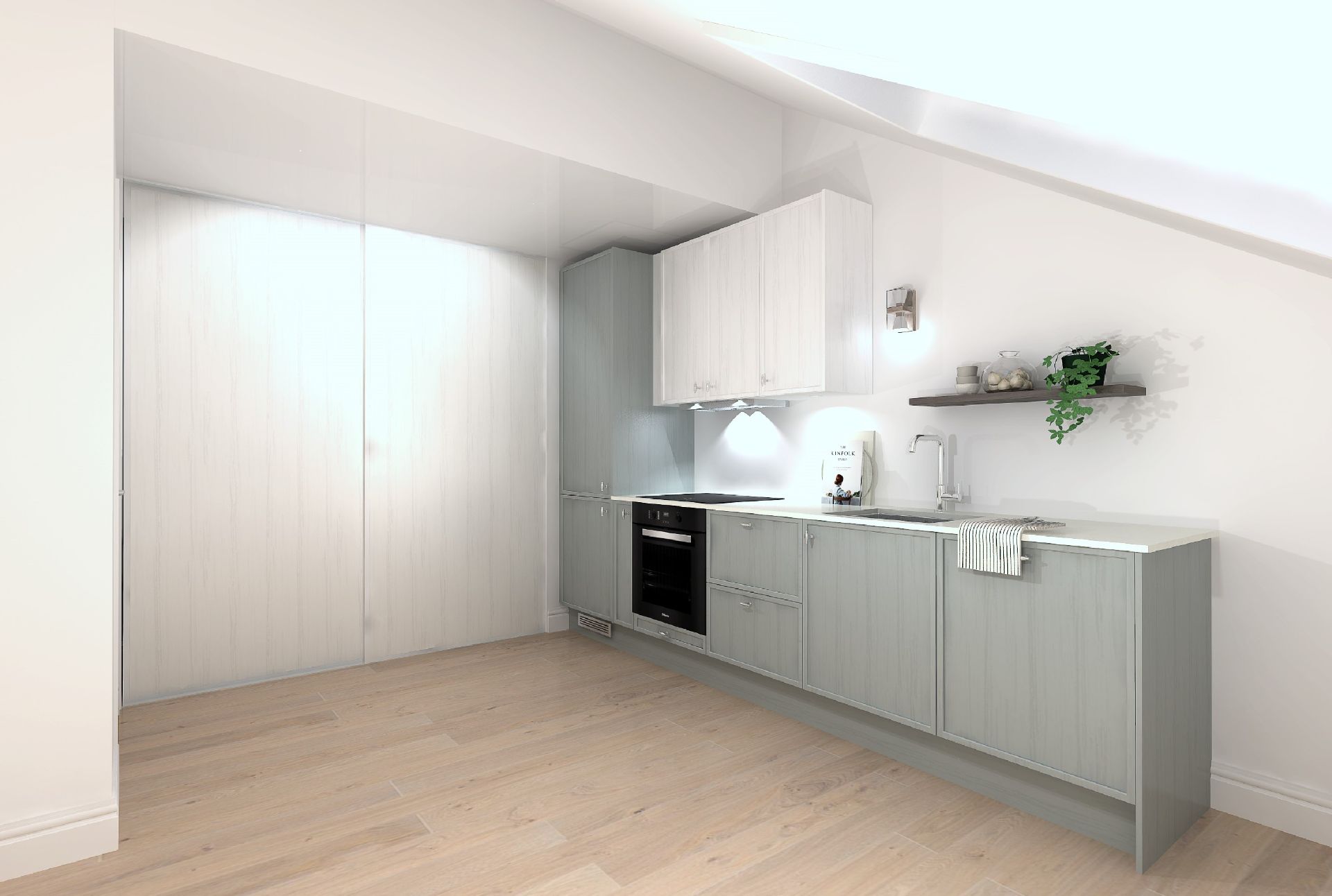 Arealeffektiv hjørneleilighet med åpen stue og kjøkkenløsning. I overgang mellom kjøkken og stue er det naturlig plass for spisebord og i stuedelen er det avsatt plass til tv-møblement. Romslig soverom og bad. Skyvedør ved kjøkken, hendig for lagring. Opplegg for vaskemaskin er i skyvedørsannordning ved kjøkken. Kjøkken fra danske Svane kjøkkenet, modell New Tradition, forener tidløs estetikk og moderne arkitektur. Overflatene og den håndlagde finishen gir det hele en flott «touch» og henvender seg til de som verdsetter kvalitet og nytenkning. Det medfølger stekeovn, steketopp, oppvaskmaskin, ventilator med kullfilter og kombinert kjøl og fryseskap fra Miele.