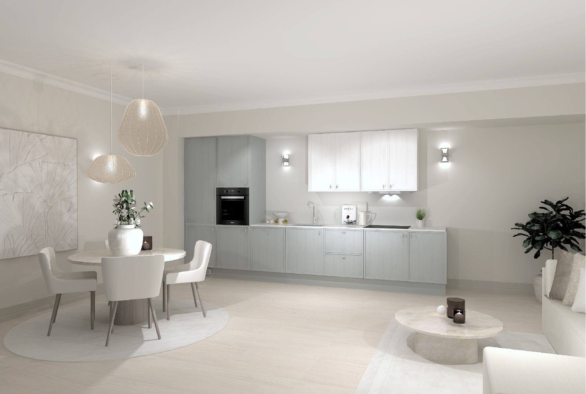 Illustrasjon: Svane Kjøkkenet. Bildet viser kjøkkenleveransen fra Svane Kjøkkenet og er ment som en illustrasjon for å vise omfanget av kjøkkenleveransen. Andre illustrerte elementer er ikke en del av leveransen.
